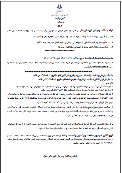 به استحضار می رساند که شبکه بهداشت ودرمان شهرستان سقز درنظردارد محل خبازی واقع درمحوطه مرکز بهداشت شهرستان سقز را درسال 1402-1403 (نوبت اول) به افراد واجد شرا یط (از طریق مزایده) واگذار نماید.