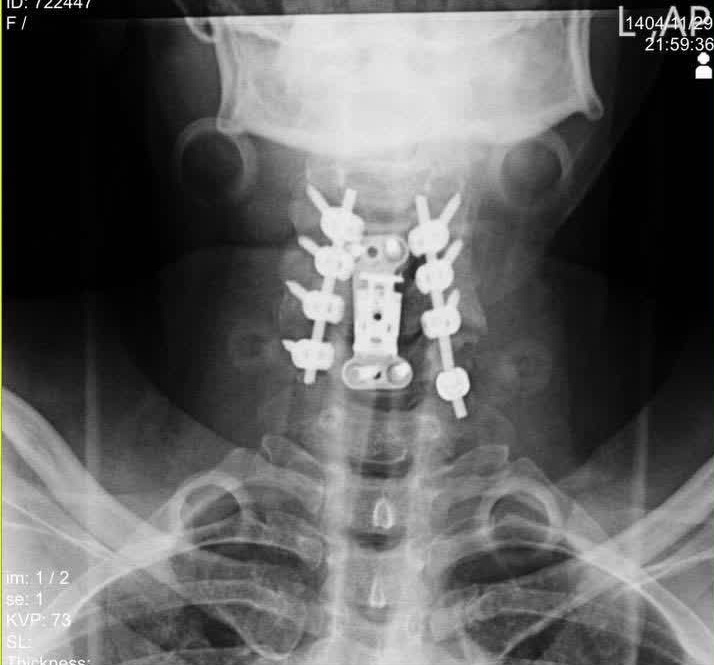دکتر محمدی ادامه داد: ۷۲ ساعت پس از جراحی اول، بیمار مجدداً به اتاق عمل منتقل شد. در مرحله، تیم جراحی با انجام «لامینکتومی» از مهره سوم تا ششم (C3-C6)، فشار را از روی بخش پشتی نخاع برداشتند و با استفاده از سیستم «پیچ و راد» (Screw and Rod) در ۸ نقطه مختلف، پایداری کامل ستون فقرات بیمار بدست آمد.